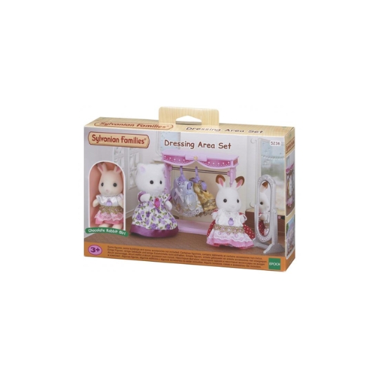 Sylvanian Families - Dressing Room Set with Chocolate Bunny. Contents: 1 chocolate bunny, 1 coat rack, 1 full-length mirror, 2 coat racks, 2 dresses.