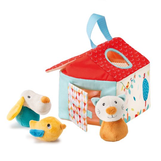 The three rattle animals can enter the house through the upper hole, and then be retrieved through the door or the roof. The net allows you to peek inside and the practical handle allows you to always carry the toy with you.